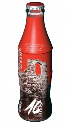 La empresa Begano colabora con la difusión de la Muralla en esta iniciativa que pusieron en marcha en colaboración con Lugo10 que supuso una tirada inicial de 3.000 botellas de Coca-Cola envueltas en una etiqueta con la Muralla de Lugo.