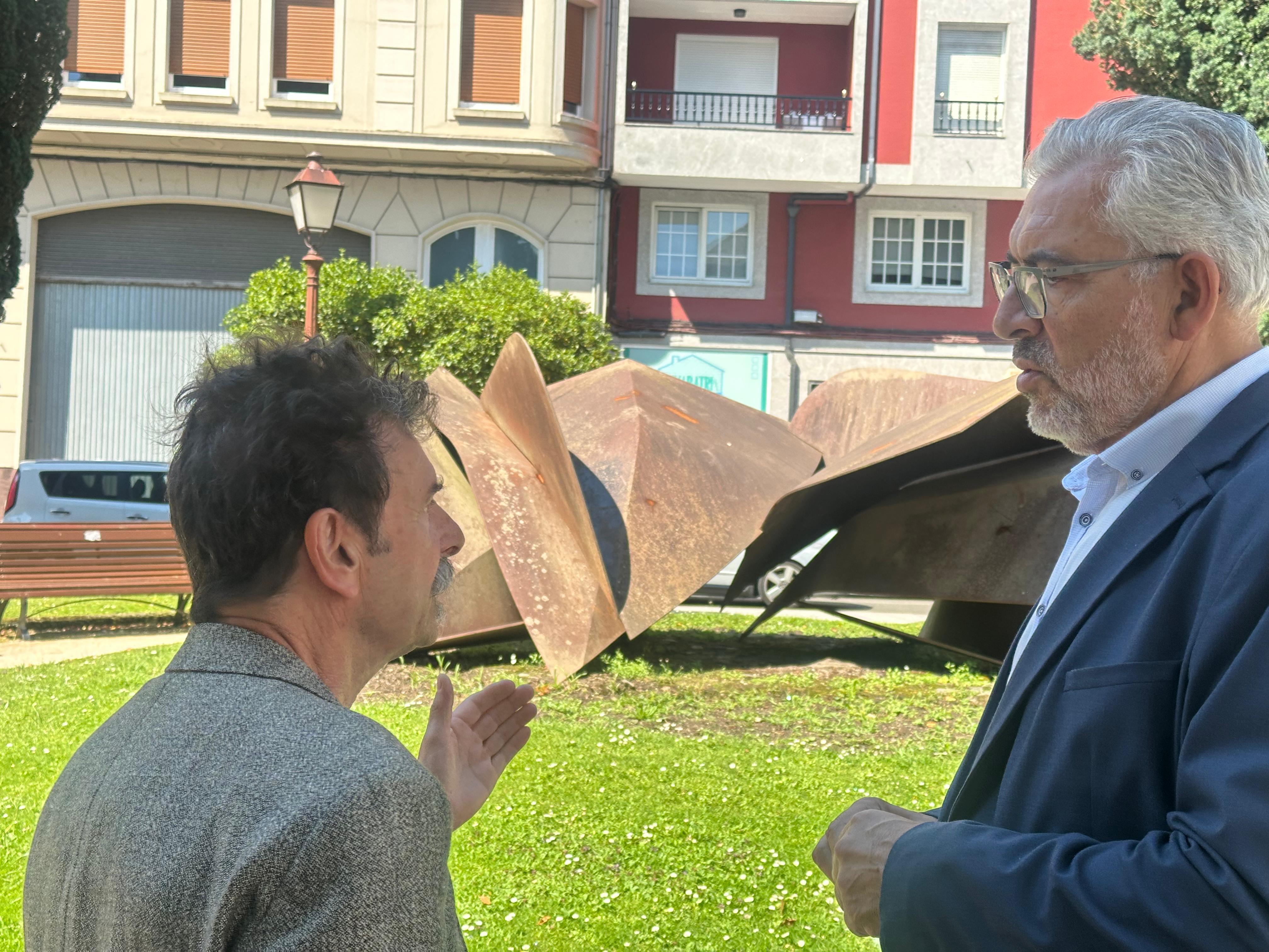 El alcalde de Lugo, Miguel Fernández, y el escultor coruñés Pepe Galán visitaron esta mañana la nueva ubicación de la obra ‘Vieiros de Seu’, una pieza realizada en acero cortén que el artista creó con motivo del Xacobeo 99, y que hasta ahora se encontraba en los jardines de Santo Domingo. A raíz de las obras de peatonalización y ante la nueva configuración de la plaza, “se buscó, de acuerdo con el escultor, un nuevo emplazamiento en el que la obra tuviera un protagonismo especial, como creo que demuestra la nueva situación en el centro del jardín de San Roque”, indicó el alcalde.
