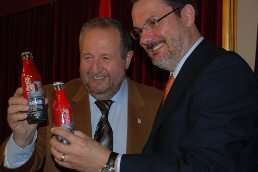 El Alcalde de Lugo, José López Orozco, y el director comercial de Begano Galicia, José Picado Carballeira, presentaron hoy la botella de Coca-Cola conmemorativa del décimo aniversario de la proclamación de la Muralla como Patrimonio Mundial.