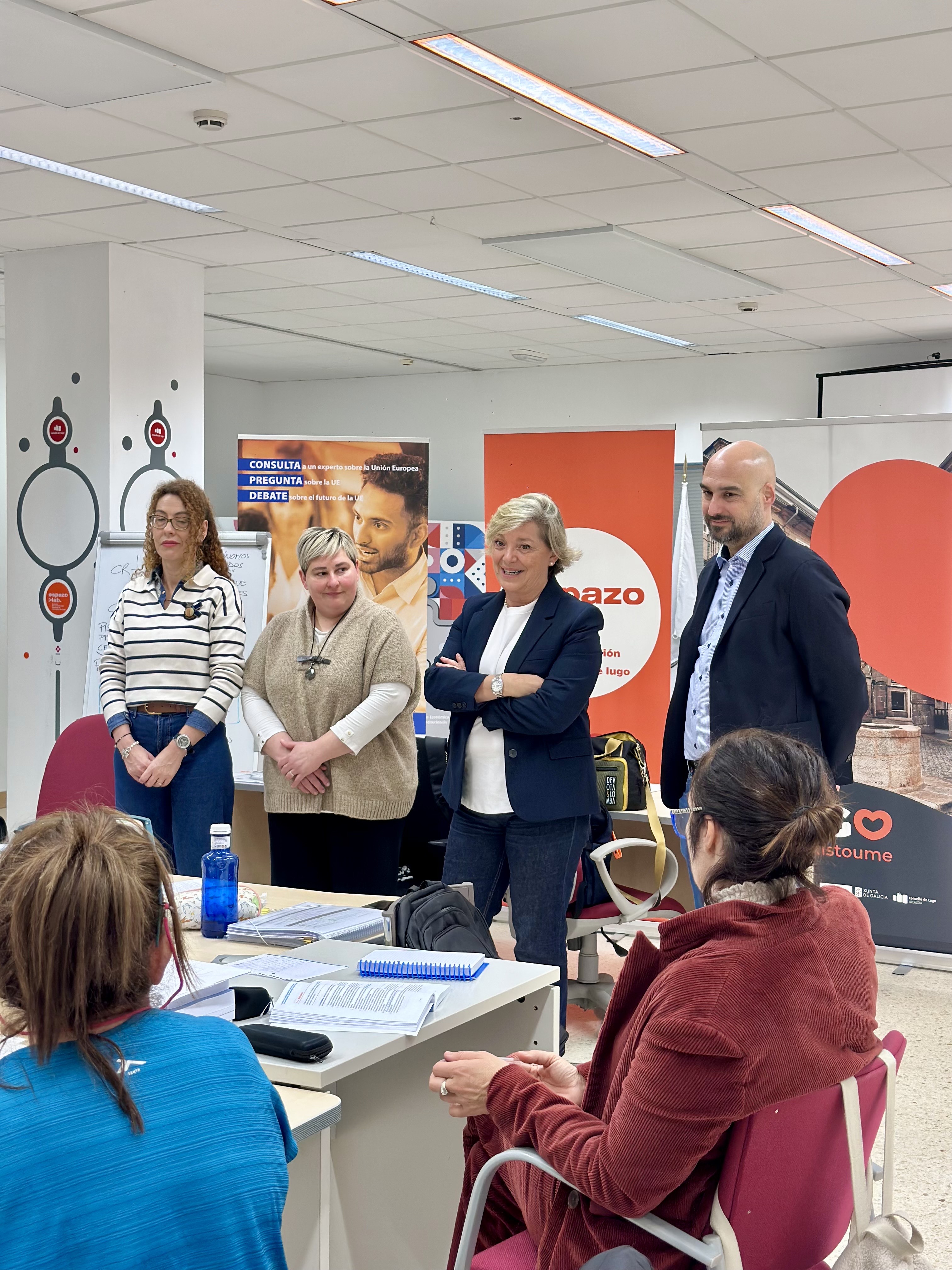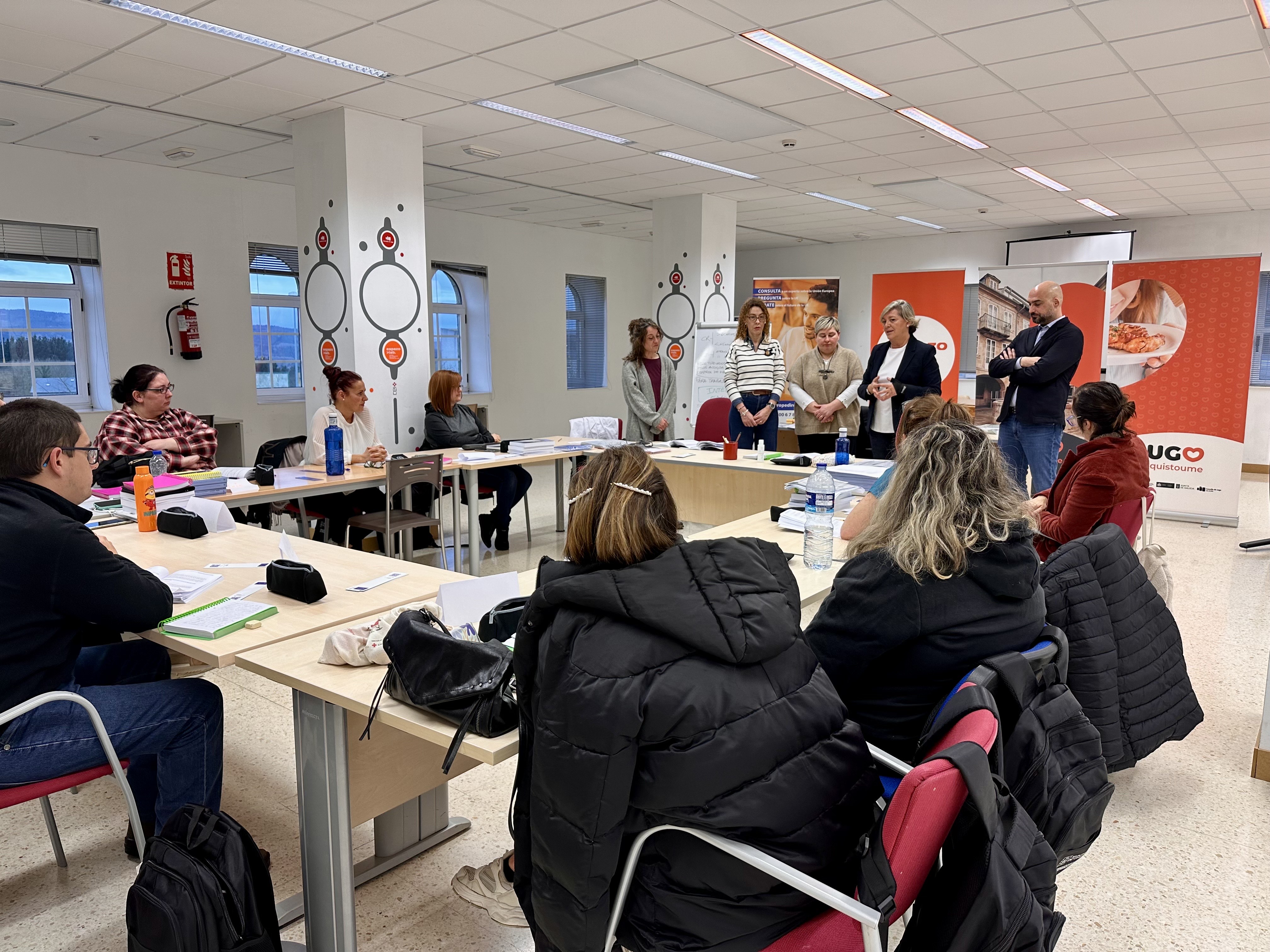 La alcaldesa de Lugo, Paula Alvarellos, acompañada por el concelleiro de Dinamización Económica, Mauricio Repetto, mantuvo un encuentro con el personal docente y el alumnado del taller dual de empleo Salus Lugo, promovido por el Ejecutivo Municipal, a través del que 20 lucenses se están formando en el ámbito sociosanitario y socioeducativo.