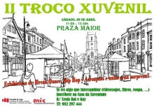 A Concellería de Cultura, Turismo, Xuventude e Promoción da Lingua, informa que este sábado 26 de abril vaise celebrar nos soportais da Praza Maior o II Troco Xuvenil. Desta maneira, entre as 11 e as 13.30 horas todos os mozos e mozas poderán intercambiar todas aquelas cousas que non lles sirvan por outras que precisen como poden ser videoxogos, libros ou roupa.
