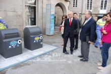O Alcalde de Lugo, José López Orozco, a Concelleira de Economía, Emprendemento e Autónomos, Sonia Méndez, a deputada provincial de Deseño e Artesanía, Regina Polín e o representante da ONCE en Lugo, Roberto Doval, asistiron a unha demostración do funcionamento dos novos contedores soterrados que se instalaron no centro histórico.