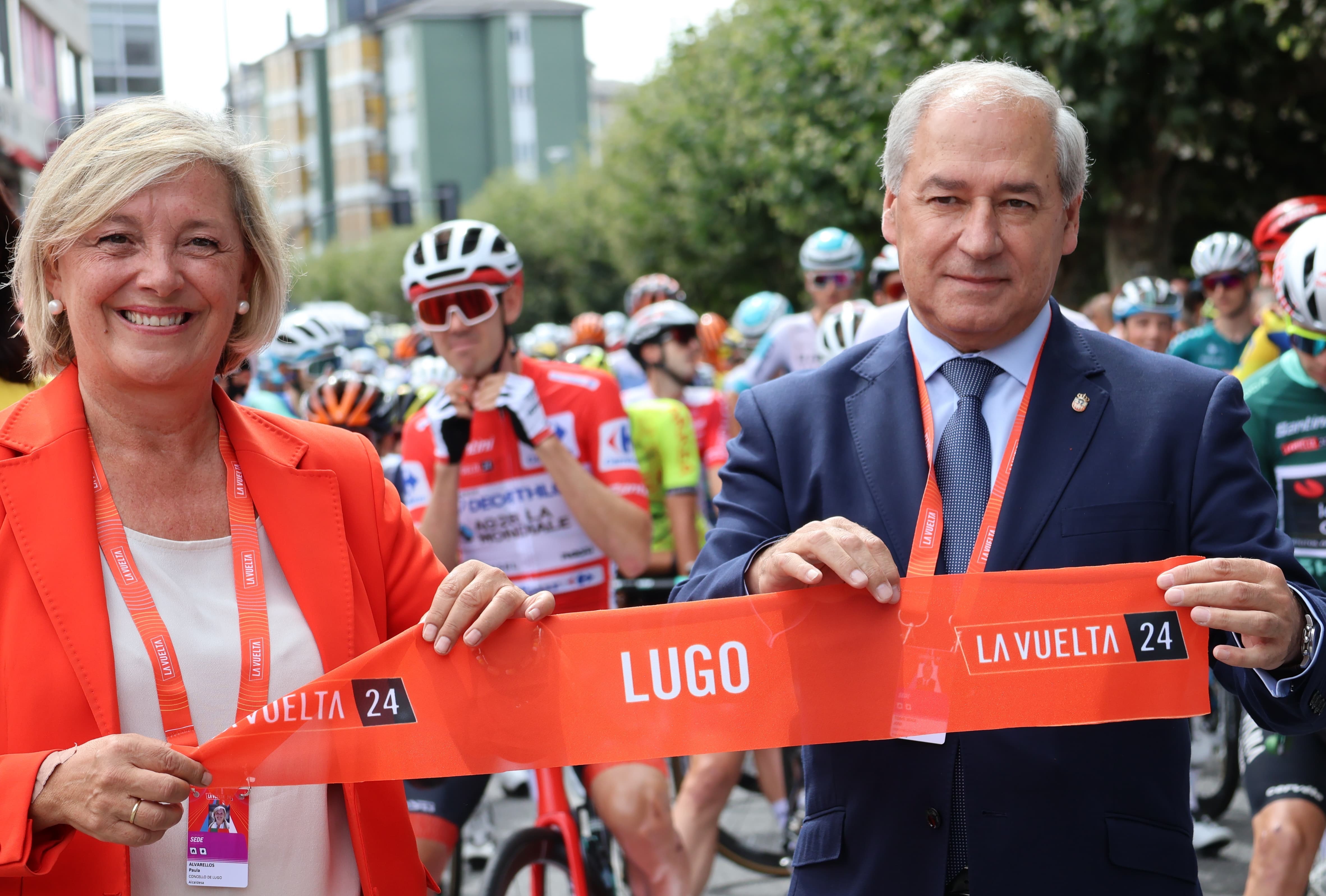 A alcaldesa de Lugo, Paula Alvarellos, destacou esta mañá no protocolario corte de cinta da decimo terceira etapa da Vuelta a España a importante proxección internacional que Lugo acada acollendo a saída desta proba deportiva. “É fundamental destacar a repercusión deste evento e analizar as súas enormes repercusións positivas para Lugo. A proxección de imaxe que recibe o noso muinicipio como sede desta carreira vaise traducir a medio prazo nun retorno económico dificilmente igualable por outro evento deportivo. Estamos a falar dunha audiencia media diaria de 1,3 millóns de espectadores en España; retransmisións en 190 países e 76 horas de sinal en directo internacional”, sinalou a rexedora.