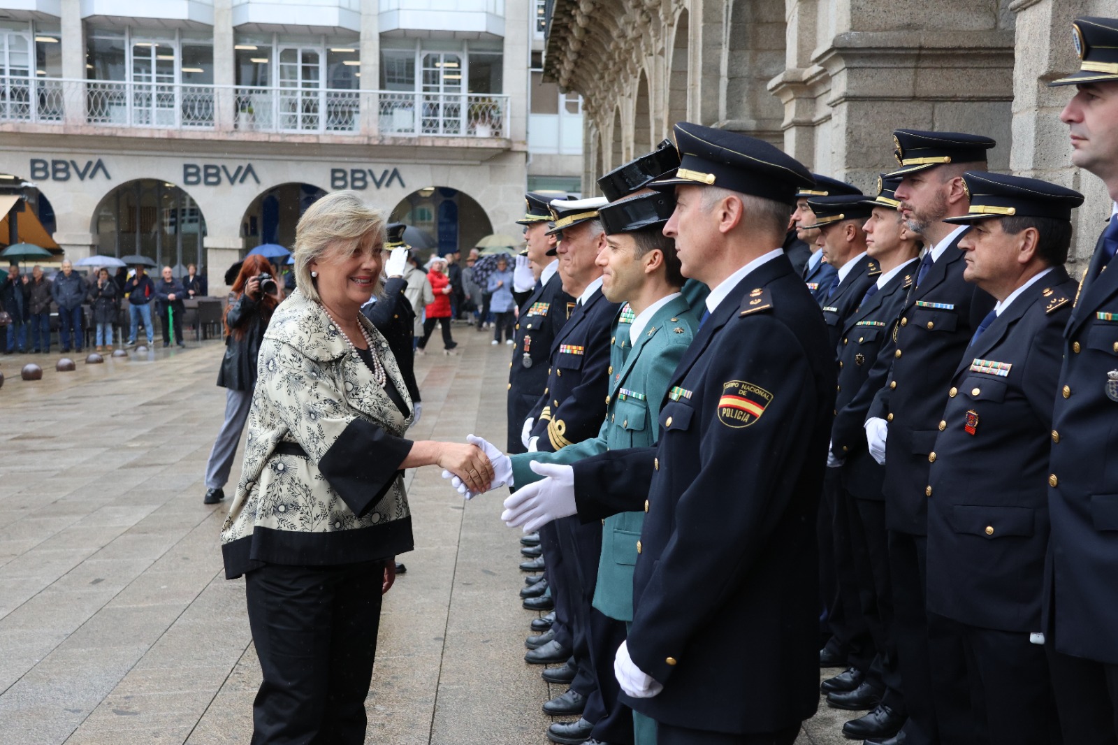 A alcaldesa, Paula Alvarellos, presidiu este martes os actos de conmemoración da Festividade da Policía Local de Lugo. A xornada comezou ás 10:30 horas, coa formación da Policía diante da Casa Consistorial, onde a rexedora pasou revista co bastón de mando, acompañada polo Intendente Jesús Piñeiro, nuha cerimonia á que tamén acudiron os concelleiros e concelleiras do equipo de Goberno xunto ao resto de representantes da Corporación Municipal e doutras institucións públicas como a Subdelegación do Goberno.