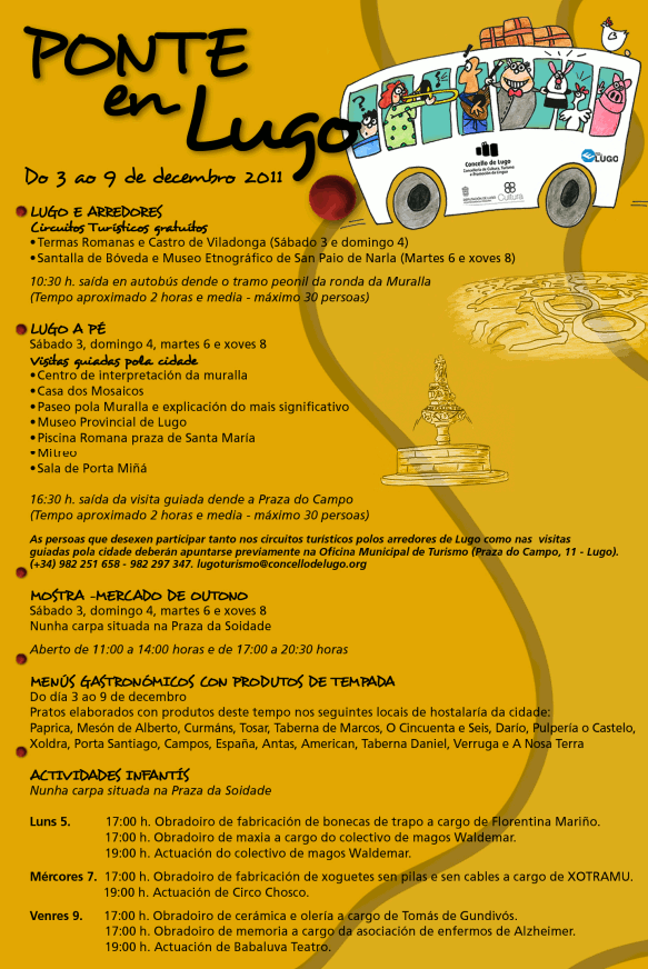 Pero as visitas guiadas son só unha parte da completa programación presentada hoxe por Antón Bao de cara a ponte, que inclúe ademais gastronomía e actividades para os máis cativos. Por exemplo, nunha carpa ubicada na Praza da Soidade haberá un Mercado de Outono os días 3, 4, 6 e 8 de decembro e os principais bares e restaurantes da cidade (Paprica, Mesón de Alberto, Curmáns, Tosar, Taberna de Marcos, O Cincuenta e Seis, Darío, Pulpería o Castelo, Xoldra, Porta Santiago, Campos, España, Antas, American, Taberna Daniel, Verruga e A Nosa Terra) prepararán menús especiais con produtos de tempada que poderán ser degustados do 3 ao 9 de decembro. Nesta iniciativa tamén colabora a Asociación Provincial de Empresarios de Hostalaría.