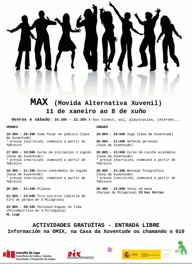A Concelleira de Cultura, Turismo, Xuventude e Promoción da Lingua, Carmen Basadre, presentou esta mañá a programación para de actividades previstas para o vindeiro trimestre do programa MAX (Movida Alternativa Xuvenil), que dará comezo hoxe venres día 11 de xaneiro e rematará o 8 de xuño.