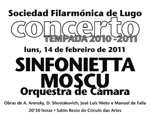 El próximo lunes, 14 de febrero actuará la Moscow Sinfonietta Chamber Orchestra. Esta orquesta nace en el 2006 en el museo Pushkin de Moscú y se forma con jóvenes valores formados en el conservatorio Chaikovski de Moscú, resultando un conjunto de un nivel artístico de primer orden. La orquesta está liderada por José Luis Nieto un joven talento español que destaca como brillante pianista y compositor que rescata la figura del solista que ejerce simultáneamente como intérprete y director de orquesta.