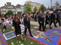 Deseguido, formouse a comitiva que se dirixiu ata a Catedral, entre as numerosas persoas que se congregaron na praza Maior, engalanada hoxe con alfombras florais instalaron durante a noite coa colaboración da confraría Nosa Señora do Pedregal de Meira.