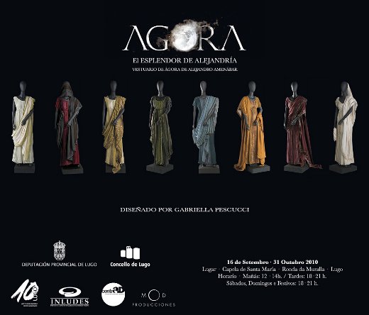 A exposición recolle unha selecta mostra dos deseños creados pola gañadora dun Oscar, Gabriella Pescucci, para a produción de Alejandro Amenábar, “Ágora”. Dezanove pezas recrean a convulsa sociedade dunha Alexandría ocupada polo Imperio Romano. Por este traballo, Pescucci acadou o Goya ao Mellor Vestiario en 2010. Os deseños están estruturados en dúas seccións. A primeira, dedicada aos deseños da protagonista, Hipatia, interpretada por Rachel Weisz; e a segunda, ás diferentes culturas e relixións que convivían na cidade de Alexandría, así poderanse ver vestimentas parabolazas, paganas e cristianas.