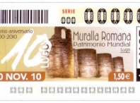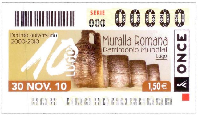 O cupón que sorteará a ONCE o día 30 de novembro, data na que se cumpren os dez anos da declaración da nosa Muralla como Patrimonio Mundial, levará a imaxe da Muralla de Lugo e o logotipo de Lugo10.