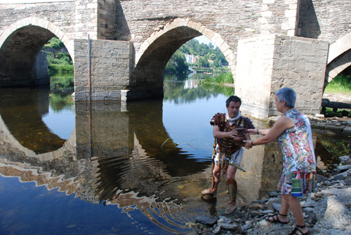 O soldado romano encheu de auga unha ánfora de barro ó pé da Ponte romana de Lugo e entregoulla á Carmen Basadre para que o Concello poida atender a solicitude feita polo municipio de Guadalcanal.