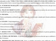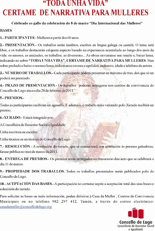 Co gallo da celebración do 8 de marzo “Día Internacional das Mulleres” o Concello de Lugo convoca “Toda unha vida”, certame de narrativa dirixido a mulleres a partir dos 60 anos. Os traballos deberán ser inéditos, escritos en lingua galega ou castelá. O tema será libre, e os traballos destacarán calquera aspecto basado na experiencia acumulada ao longo dos anos da vida: os amores, as amizades, os traballos, as diversions...