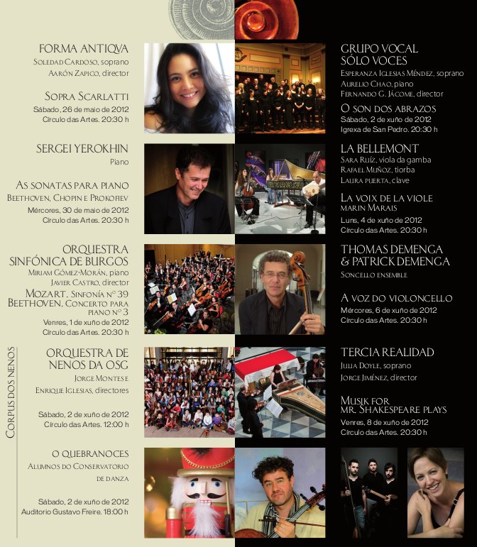 O que xa está considerado como o mellor festival de música clásica de Galicia e conta cun enorme recoñecemento a nivel estatal, cumpre este ano a 40 edición, cun marcado selo lucense. Así o explicou o Tenente de Alcalde, Antón Bao na presentación do programa do Festival de Música Clásica Cidade de Lugo 2012 – XL Semana de Música do Corpus, cando presentou aos representantes da Sociedade Filarmónica de Lugo, Julián Parga e José Luis Díaz, novos responsables da organización deste festival. Xunto a eles tres, estivo a Directora do Conservatorio Profesional de Danza de Lugo, Isabel Méndez, centro que tamén participa por vez primeira cun espectáculo de danza.