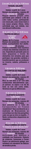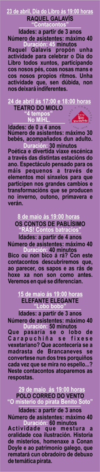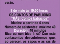 A próxima cita será o xoves 8 de maio coa historia Rás!Contos batracios interpretado por Os Contos de Pablísimo e que está dirixido a nenos e nenas a partir de 4 anos e ten unha duración de 40 minutos.