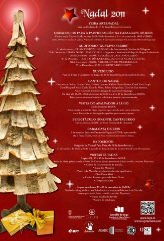 Dentro da programación inclúese tamén a Feira de Artesanía ArteNadal, aberta na Praza da Soidade ata o día 5 de xaneiro. Tamén volven as visitas guiadas que tanto éxito tiveron na ponte de decembro e que se repetirán nas fins de semana de Noiteboa e Fin de Ano. Así, os venres 23 e 30 de decembro pola tarde terán lugar rutas a pé pola cidade. Esta ruta urbana, denominada Lugo a pé, incluirá a visita ao Centro de Interpretación da Muralla, a Casa dos Mosaicos, o Museo Provincial, a piscina romana que acaba de ser inaugurada na praza de Santa María, o templo de Mitra, a sala Porta Miñá e un paseo pola Muralla cunha explicación do máis significativo.