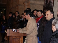“Boas tardes lugueses e luguesas. É un pracer e unha honra acharme hoxe aquí para botar fóra de min unhas verbas que, agardo, saiban transmitir o sentir dunha comunidade de persoas ás que represento en calidade de pregoeiro deste Entroido 2012, na sempre fermosa e vedraña cidade de Lugo.