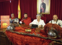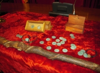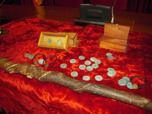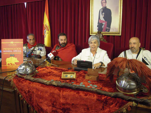 A Concelleira de Cultura, Turismo, Xuventude e Promoción da Lingua, Carmen Basadre, xunto co presidente da Asociación Cohors III Lucensium, Manuel Fernández, e escoltados por soldados romanos, e na que estivo o emperador Galbo, Ildefonso de Andrés, presentaron esta mañá a moeda oficial que esta asociación acuña, por quinto ano, para a festividade do Arde Lucus.